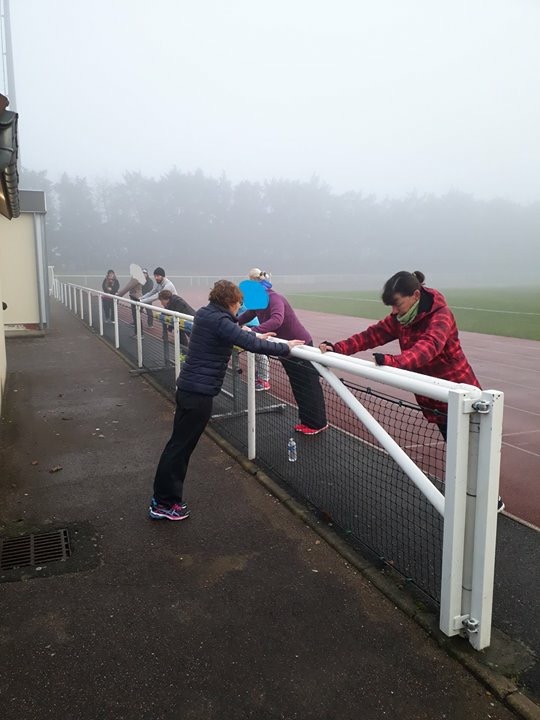 Jusqu’aux jus tout allait bien ….mais quand nous avons annoncé que l’échauffement et le challenge pompes se ferait dehors, quelques plaintes se sont faites entendre mais elles ont étés vite remplacées par des encouragements et par une belle motivation. 3 circuits intenses suivi de 10 mn de récupération active (marche, course à allure fondamentale)