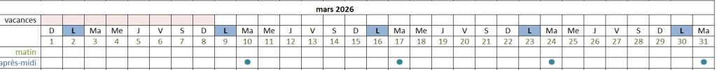 Véronique vous accueille dans notre club-house à certains moments : le matin (points verts sur le planning) de 9h30 à 12h30 ou/et l’après-midi (points bleu sur le planning) de 14h00 à 17h00 sauf le vendredi où l’horaire est 13h-16h,