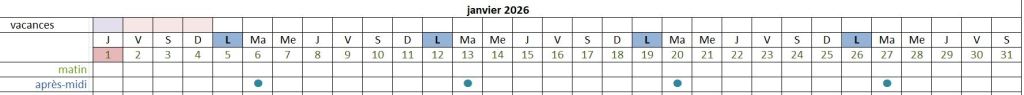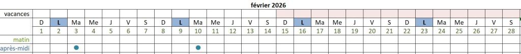 Véronique vous accueille dans notre club-house à certains moments : le matin (points verts sur le planning) de 9h30 à 12h30 ou/et l’après-midi (points bleu sur le planning) de 14h00 à 17h00 sauf le vendredi où l’horaire est 13h-16h,